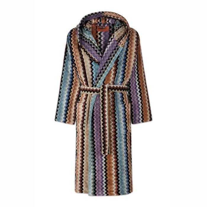 Adam badekåpe fra Missoni Home gir deg en unik mulighet til å omfavne luksus og stil i din egen hverdag. Denne badekåpen presenterer Missonis ikoniske zigzag mønster i en blendende fargepalett av brun, lilla, blå og beige, og tilbyr en enestående kombinasjon av eleganse og komfort.